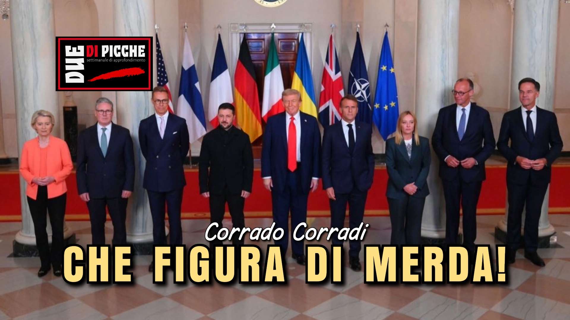 Mi chiedo cosa siano andati a fare a Washington i quattro premier dei paesi UE (Meloni, Macron, Merz e Stubb), accompagnati dalla presidente della Commissione Europea, Von der Leyen, e dal Segretario della NATO, Rutte. E a loro si è pure unito un premier che con l’UE non c’entra niente, l’inglese Starmer. Erano lì per scortare Zelensky dal “preside” che avrebbe comunicato loro se il loro protetto fosse stato bocciato o rimandato?