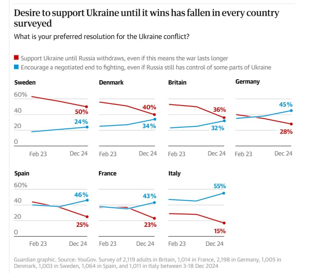 Il sondaggio di dicembre condotto da YouGov in Francia, Germania, Italia, Spagna, Svezia, Danimarca e Regno Unito ha rilevato che il desiderio dei cittadini di sostenere l’Ucraina fino alla vittoria – anche se ciò significava prolungare la guerra – era crollato in tutti e sette i paesi negli ultimi 12 mesi. Questo mentre il ritorno di Trump alla Casa Bianca mette in discussione la disponibilità USA a sostenere ulteriormente Zelenskyy.