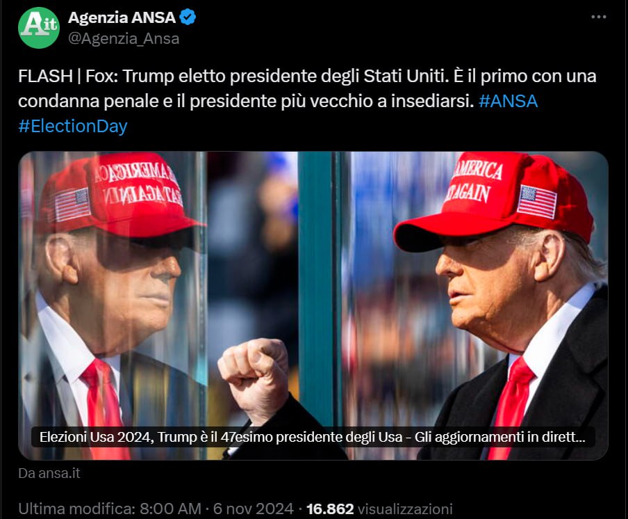 Agenzia Ansa ore 8:36. “Trump eletto 47mo Presidente degli Stati Uniti, il primo con condanna penale e il presidente più vecchio ad insediarsi.”