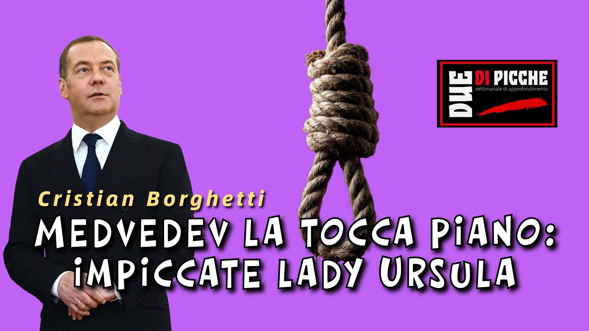 Conosciamo Medvedev, quel suo esprimersi senza peli sulla lingua, oltremodo colorito, inatteso, forse inappropriato – quasi fosse affetto dalla sindrome di Tourette – quindi non ci sconvolgono gli anatemi tipo “Gli europei prendano d’assalto Bruxelles e impicchino tutti i commissari europei, inclusa, ovviamente, la vecchia pazza Lady Ursula, ai pennoni delle bandiere dei Paesi dell’Ue. Non servirà a niente, certo, ma almeno sarà divertente”.