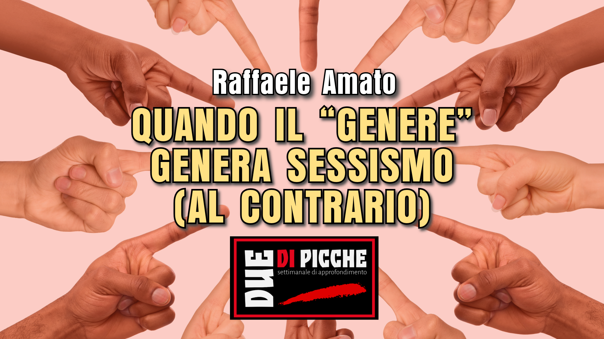 Per cui il lemma “genere”, ripetuto fino allo sfinimento, diventa uno strumento al servizio di un’ideologia che mira alla contrapposizione tra i sessi. Una forma di sessismo spietato e capovolto che vede nell’uomo – specie se bianco ed etero – l’origine di ogni male, un nemico da combattere e da rieducare.