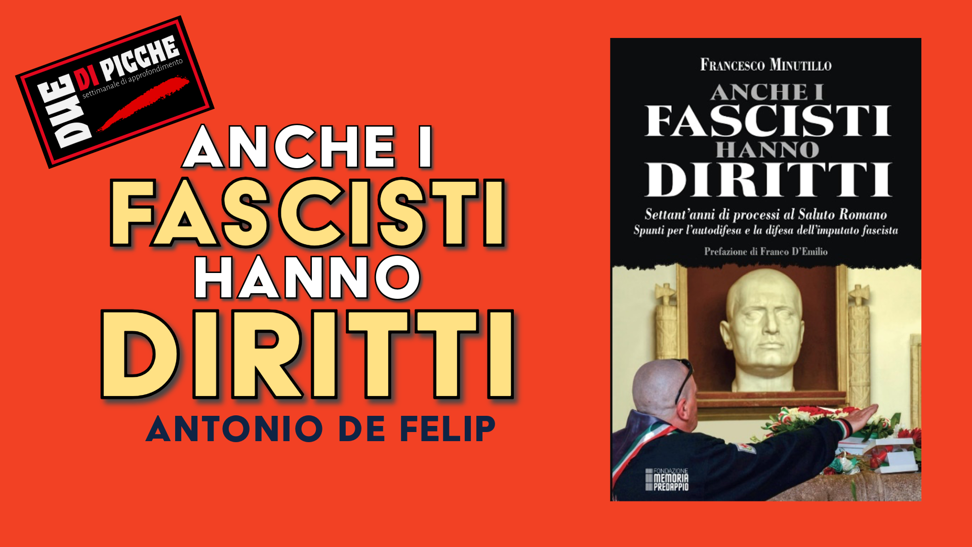 Come è possibile, una volta venuti a conoscenza della sua pubblicazione, non acquistare, leggere e pubblicizzare un libro che ha il seguente, intrigante e provocatorio titolo: Anche i fascisti hanno diritti ? E con un primo sottotitolo: Settant’anni di processi al Saluto Romano (maiuscole nel testo)? E il cui secondo sottotitolo è: Spunti per l’autodifesa e la difesa dell’imputato fascista ? E che ha come Editore la Fondazione Memoria Predappio ? E che in copertina mostra la foto di un pellegrino in camicia nera che esibisce un saluto romano alla tomba e al busto di Mussolini?