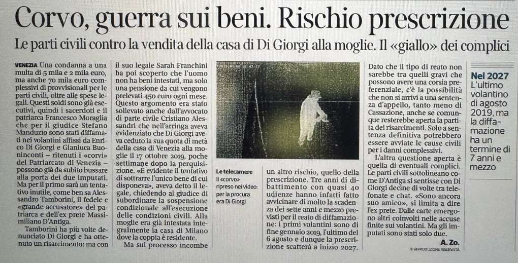 Non si auto-incensino con vane speranze di crogiolarsi nei soldi perché difficilmente avranno risarcimenti: ho ottenuto condanna penale del signor Di Giorgi anni fa e con fatica il pignoramento dell’unico bene possibile che non può essere certo aggredito ulteriormente. Non è certo il dr. Di Giorgi uno sprovveduto e difatti nel processo è emerso di come abbia egli ceduto anche le quote della piccola casa di Venezia alla moglie. L’articolo del Corriere della Sera del 7 marzo 2025 ben descrive queste circostanze indicando anche l’importo che mi viene versato mensilmente da anni quale risarcimento così come il rischio della prescrizione dello stesso processo. Che moralità dimostrano questi preti che bramano ricchezze e prebende sguinzagliando i loro legali per reclamare somme che probabilmente mai ne disporrano?