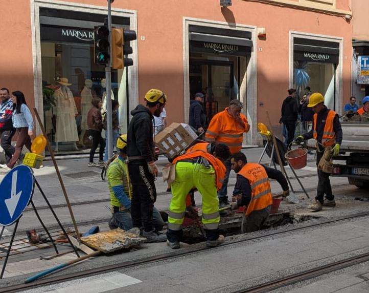 Un tratto tutto sommato trascurabile, degli oltre 16 chilometri di percorso della nuova tramvia. Eppure, dopo una manciata di giorni, ecco nuovamente le maestranze all’opera. A fare cosa? Sicuramente, nulla che abbia a che vedere coi binari. Guardando attentamente la foto, si vede come gli uomini siano impegnati a fare qualcosa nello spazio che divide le due rotaie.